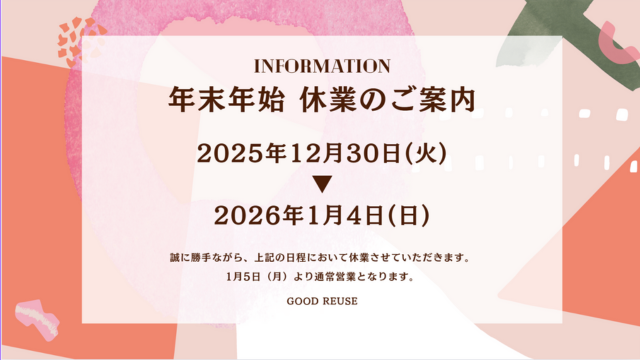 また2025年12月29日(月)の営業は16時までの営業となります。ご了承ください。